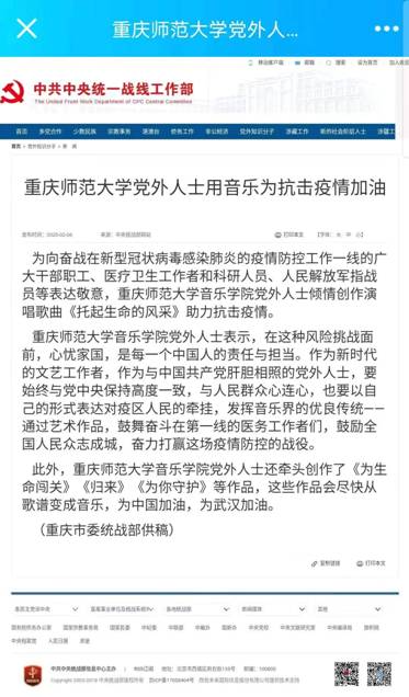 2月6日,中央统战部报道了我校民进会员、音乐学院周亚辉教授倾情创作歌曲《托起生命的风采》,助力抗击疫情。下图为报道截图: