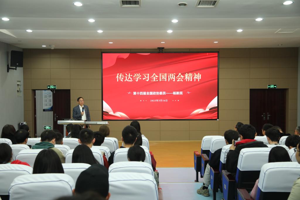 杨新民委员首先向大家介绍了两会基本情况,并围绕政府工作报告,全国人大常委会、全国政协常委会工作报告中有关教育、科技方面的内容和热点话题进行了宣讲。重点传达了习近平总书记在参加十四届全国人大一次会议江苏代表团审议,看望政协民建、工商联界委员,以及在全国人大一次会议闭幕会上的三次重要讲话精神,分享了作为第十四届全国政协委员的履职情况及重要体会。