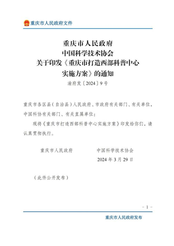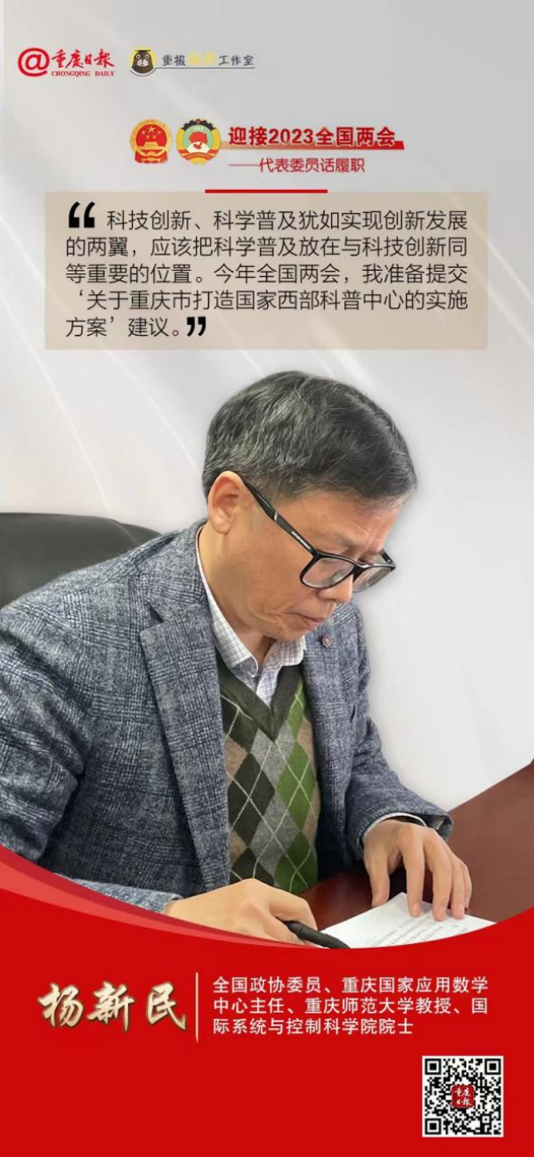 4月8日,重庆市人民政府、中国科学技术协会联合印发了《重庆市打造西部科普中心实施方案》(以下简称“方案”)。方案对全国政协委员、重庆国家应用数学中心主任、mansion88明升教授杨新民在2023年全国两会期间提交的《关于支持重庆打造西部科普中心的建议》提案进行了采纳。提案中提出的有关“成立西部科普工作联盟”“建设科普阵地样板”“建设数字科普样板”等建议被采纳为方案中的重点举措。