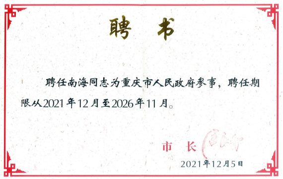 近日,重庆市人民政府下发通知,聘任我校职教师资学院南海教授为重庆市人民政府参事,聘任期限从2021年12月至2026年11月。