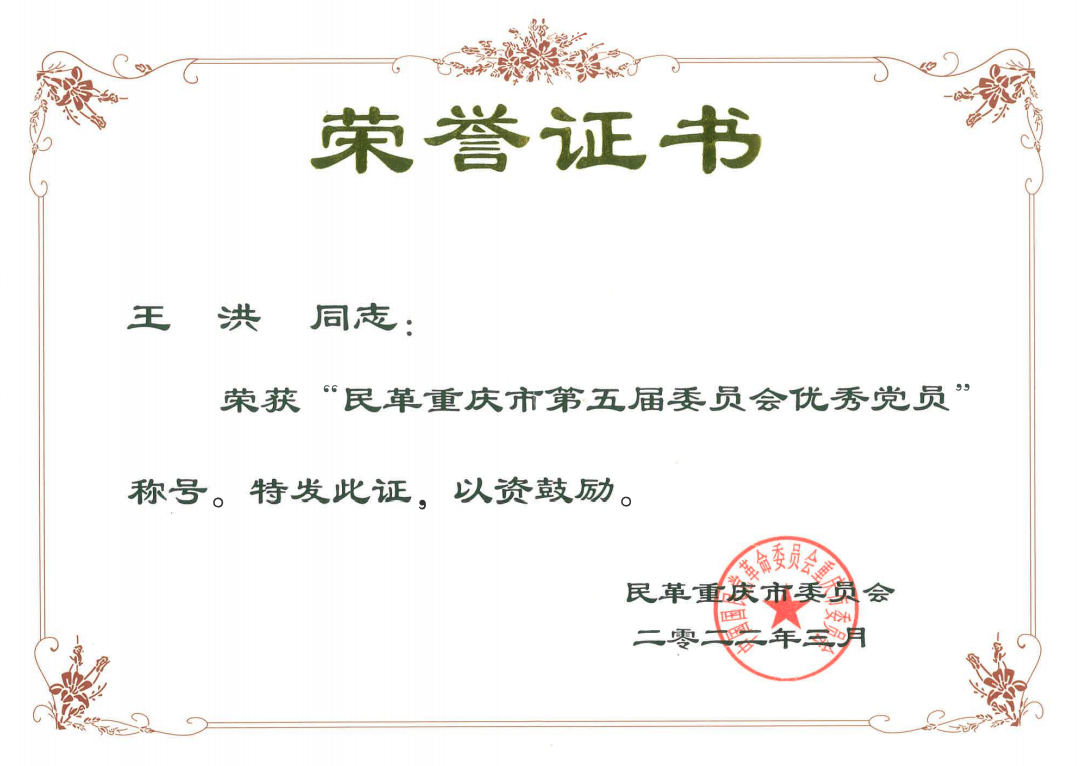 近日,民革重庆市委员会发布《关于表彰民革重庆市第五届委员会先进集体、优秀党员及优秀党务工作者的决定》,表彰近五年在民革各项工作中成绩优异的先进集体和先进个人。我校沙区政协委员,民革支部副主委,教务处现代教育技术科科长王洪获得“民革重庆市第五届委员会优秀党员”荣誉称号。