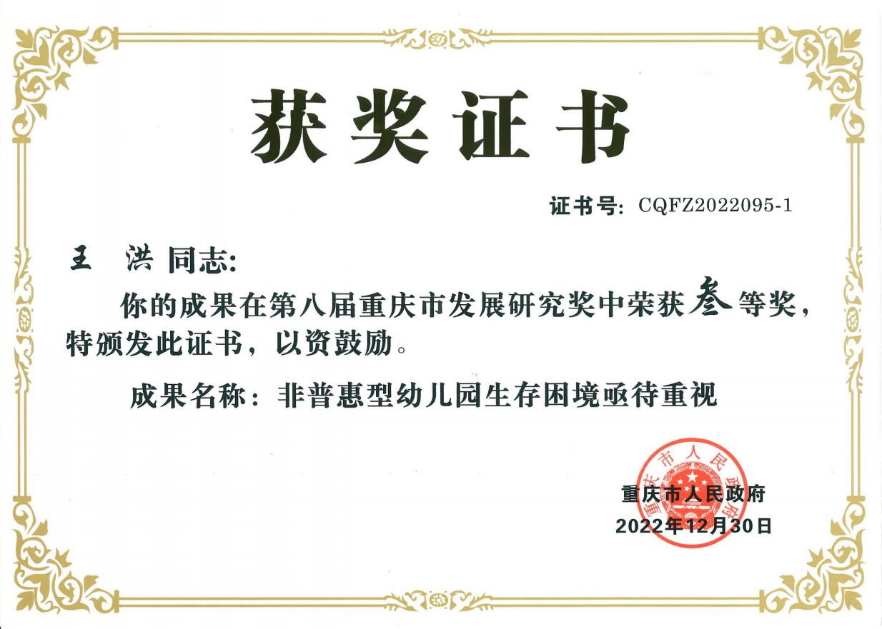 1月10日,重庆市人民政府办公厅发布《重庆市人民政府关于表彰重庆市第十一次社会科学优秀成果和第八届重庆市发展研究优秀成果的决定》表彰具有前瞻性、原创性和长期性的优秀决策咨询研究成果。我校民革支部副主委,教务处现代教育技术科科长王洪获得第八届重庆市发展研究奖三等奖。