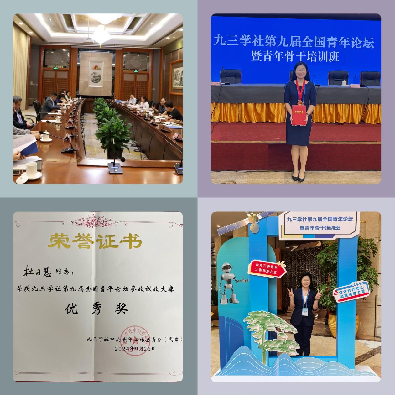 此次论坛以“颠覆性技术创新赋能新质生产力”为主题,通过“融冰启航”团建、参政议政培训、青年活动分享、“你说我听”、参观调研、“致敬先贤 逐梦前行”才艺展示、参政议政大赛等环节,不仅拓宽了青年社员们的视野,提升了参政议政能力,而且彰显了社员们团结奋进的精神和积极履职的责任感。我校九三社员杜习慧提交了有关生物多样性数据库的提案,并以小组形式参加了参政议政大赛,荣获参政议政大赛优秀奖。期间,杜习慧还参加了由九三学社中央参政议政部李军华副部长主持的小型座谈会,与李部长进行了面对面的交流,进一步加深了对参政履职的理解和认识。